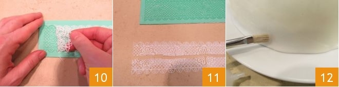 Em seguida, asse em forno estático pré-aquecido a 120°C por 5-6 minutos (ou em forno ventilado pré-aquecido a 100°C por cerca de 4 minutos). Preste atenção para cobrir sempre o preparado para decorações quando não estiver usando para evitar que seque. Uma vez assado, deixe esfriar e retire delicadamente a folha de renda 10. Corte-a ao meio horizontalmente 11 e, para aplicá-lo, pincele com cola comestível a parte inferior do bolo já coberto com a pasta americana 12.