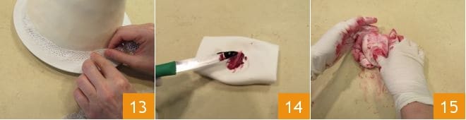 Cole a tira de renda fazendo-a aderir bem à cola 13. Puxando entre o polegar e o indicador algumas partes da renda, à medida que a cola, você conseguirá criar também as dobras. Continue assim e, sempre ajudando-se com a cola comestível, cole as várias tiras de renda de baixo para cima até cobrir toda a superfície. Pegue a parte restante da pasta americana (350 g) e adicione algumas gotas de corante rosa 14, então trabalhe com as mãos 15 até obter uma cor homogênea. Se parecer muito claro, adicione mais uma gota de corante e trabalhe novamente, até obter a gradação desejada.