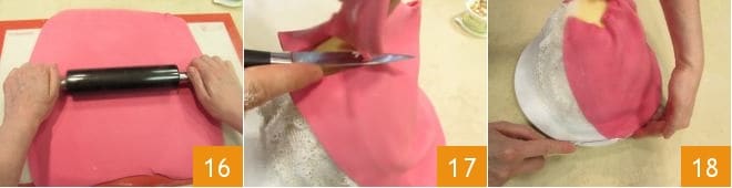 Neste ponto, estenda sobre um tapete polvilhado com amido de milho, sua pasta americana rosa, até obter uma espessura de cerca de 5-6 mm 16 e use para terminar o outro lado da saia. Coloque a folha de açúcar sobre a parte descoberta do bolo, muito levemente, sempre usando cola comestível para colar na parte já coberta com a pasta americana branca. Tente criar dobras com os dedos, para que a saia pareça o mais natural possível. Corte novamente o excesso de pasta tanto na parte superior 17 quanto na parte inferior 18.