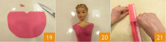 Trabalhe alguns minutos com as mãos as sobras da pasta rosa, para uniformizá-la novamente. Estenda e use uma parte para fazer o corpete da sua Barbie, reproduzindo também o decote fazendo um corte em V na parte superior 19. Cubra então o busto da Barbie 20 e remonte também os braços. Use o preparado para decorações e, como feito anteriormente para a renda, adicione uma colher sobre um tapete para fazer as pérolas, e raspe com uma espátula 21.