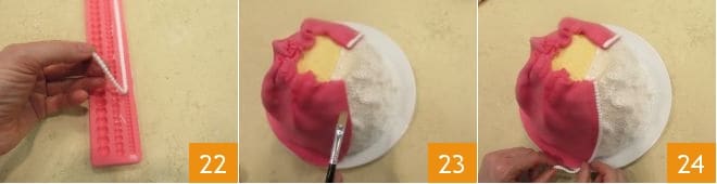 Asse novamente em forno estático pré-aquecido a 120°C por 5-6 minutos. Deixe esfriar, então retire a tira de pérolas 22 e cole com cola comestível ao redor da saia (23-24). Reserve um pequeno pedaço que será usado para fazer o colar e a pulseira.