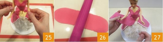 Neste ponto, posicione o meio busto da Barbie no buraco presente no centro do bolo 25. Para fazer os últimos enfeites, use a pasta americana rosa restante e corte uma tira de cerca de 6-7 cm de largura. Decore-a com um rolo para cake design que permitirá obter linhas horizontais 26. Modele com uma faquinha as bordas, pincele o verso com cola comestível e prenda entre o busto e a saia para cobrir as partes descobertas 27.