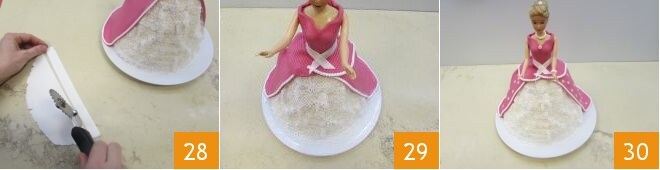Estenda novamente as sobras e, com uma faquinha, corte a tiara e posicione-a nos cabelos da Barbie. Coloque também a tira de pérolas ao redor do pescoço e una as duas extremidades com cola, repita a mesma operação ao redor do braço para fazer a pulseira. Estenda também a pasta americana branca restante e corte uma tira de cerca de 1 cm e meio 28, pincele o verso com cola e prenda na cintura da Barbie, para fazer o cinto 29. Faça com as sobras de pasta pequenas flores para posicionar e embelezar a saia. Seu bolo Barbie está pronto 30, coloque-o na geladeira por algumas horas antes de servir.