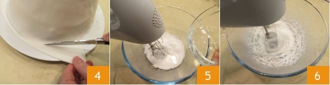 Corte o excesso de pasta americana na base do doce, seguindo exatamente o perímetro do doce 4, evitando que saia para o prato. Trabalhe as sobras de pasta com as mãos e reserve, embrulhadas em filme plástico, para as decorações finais. Coloque o bolo na geladeira e dedique-se às decorações. Aqueça a água no micro-ondas e leve à temperatura de 40°C, então adicione-a em uma tigela onde você já terá colocado o preparado para decorações 5. Misture com um batedor até obter um composto cremoso 6.