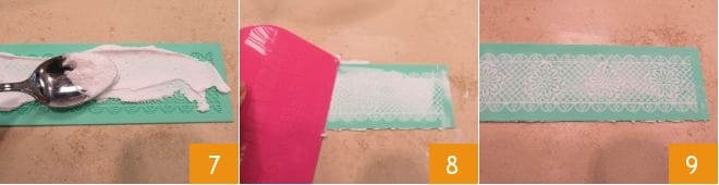 Pegue uma colher dessa mistura e espalhe sobre um tapete de silicone, adequado para fazer rendas 7. Ajudando-se com uma espátula, raspe a superfície 8, removendo o excesso 9.