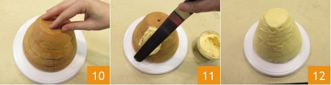 Coloque o último disco 10 e, com a ajuda de uma espátula, comece a espalhar o creme de manteiga sobre o bolo 11, até cobrir toda a superfície 12, para que a pasta americana que será usada depois para cobrir o bolo adira melhor.
