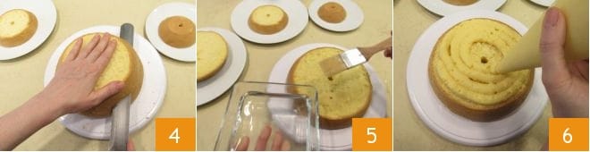 Apenas quando todos os preparos estiverem completamente frios, proceda a cortar o bolo. Divida seu pão de ló em 4 discos 4. Neste ponto, você terá tudo o que precisa para montar o bolo. Comece molhando a camada de pão de ló mais larga com a calda já preparada (e agora fria) usando um pincel 5. Transfira o creme de confeiteiro para um saco de confeitar e coloque-o de maneira circular sobre o disco de bolo 6, já molhado.