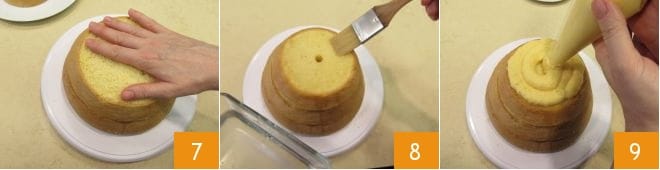 Continue dessa forma, posicionando a camada certa de pão de ló 7, do maior para o menor, para recompor o doce. Complete seu bolo molhando cada camada 8 e recheando com o creme de confeiteiro 9.