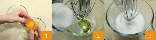 Para preparar o bolo Barbie, a primeira coisa é começar pela preparação do Pão de Ló, com o método de divisão a frio. Pegue os ovos, que devem estar em temperatura ambiente, e separe as claras das gemas 1. Coloque as claras na tigela da batedeira, adicione uma pitada de sal e cerca de 1/3 da quantidade total de açúcar indicada 2. Para montar adequadamente, não deve haver traços de gemas nas claras e tanto a tigela quanto o batedor da batedeira devem estar bem limpos. Ligue a máquina em velocidade média e bata as claras até atingir um ponto brilhante, não em neve, para obter uma massa uniforme e não em flocos dispersos, evitando assim a formação de grumos na massa; se você não tiver uma batedeira, pode usar um batedor elétrico. Quando as claras estiverem brancas, suficientemente volumosas e macias, pare a batedeira 3.