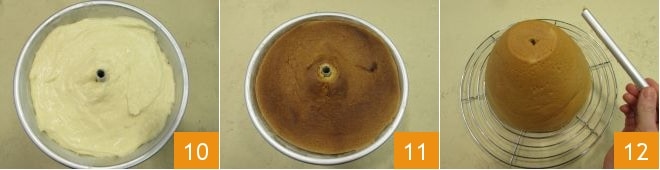 Despeje tudo na forma apropriada (para o bolo Barbie), previamente untada e enfarinhada, de diâmetro de 20 cm e altura de 17 cm, e nivele levemente com uma espátula 10. Asse em forno estático pré-aquecido a 180°C por 50 minutos, se usar forno ventilado, asse a 160°C por cerca de 40 minutos. Uma vez assado (é sempre recomendável fazer o teste do palito), desenforme seu bolo 11, deixe esfriar levemente na forma e depois desenforme-o totalmente sobre uma grade, em seguida, remova delicadamente o eixo central 12.