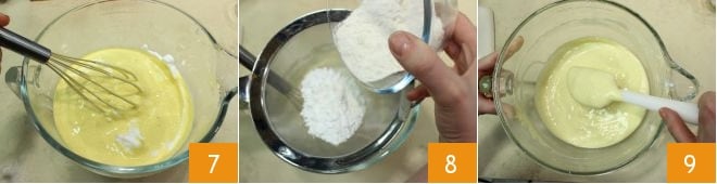 e misture com um batedor 7 (ou uma espátula) de cima para baixo para não desmontar o composto. Neste ponto, adicione a farinha e o amido de milho peneirados juntos 8 e misture ao composto com uma espátula 9.