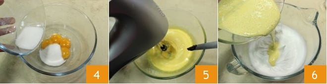 Enquanto isso, corte uma fava de baunilha com uma faquinha, retire as sementes e reserve. Despeje a quantidade restante de açúcar (os outros 2/3) na tigela que contém as gemas 4, então comece a bater com um batedor elétrico em velocidade média. Adicione também as sementes da fava de baunilha 5 e bata até obter um composto espumoso, com uma boa formação de bolhas e de cor amarelo claro. Delicadamente, una as gemas batidas às claras 6,