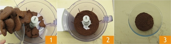 Para preparar o bolo de biscoito sem forno, como primeiro passo, prepare a base. Coloque os biscoitos de cacau em um processador de alimentos 1 e triture até obter um pó 2. Transfira para uma tigela 3 e reserve.