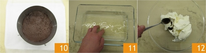 Quando tiver coberto bem a base 10, transfira para o refrigerador. Agora, coloque a gelatina em folhas de molho em água fria 11. Enquanto isso, em uma tigela, coloque o queijo cremoso e o extrato de baunilha 12.