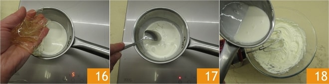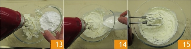 Trabalhando com uma batedeira elétrica em baixa velocidade, adicione também o açúcar de confeiteiro 13 e 100 g de creme de leite 14. Continue a bater até obter um creme liso e areado 15.