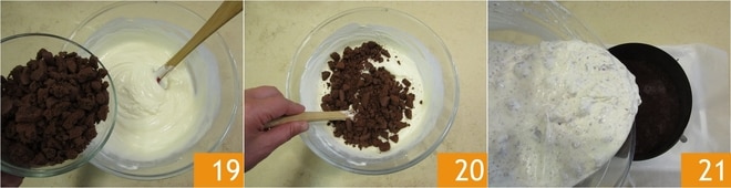 Misture novamente e quando estiver bem absorvido, adicione os biscoitos previamente quebrados à mão 19. Misture novamente 20, depois transfira a mistura para dentro da forma com a base de biscoitos de cacau 21. Nivele bem a superfície e coloque na geladeira por pelo menos 4 horas.
