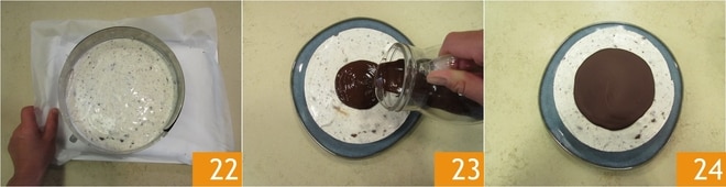 Após esse tempo, derreta os 100 g de chocolate que servirão para a decoração final. Desenforme o bolo 22, remova o papel de acetato e coloque-o em um prato de servir. Despeje o chocolate no centro do bolo, formando um disco, sem cobri-lo totalmente 23. Coloque novamente na geladeira até que o chocolate tenha endurecido. Depois, você pode servir 24.