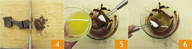 Pique finamente o chocolate 4 e derreta-o em banho-maria ou no micro-ondas. Derreta também a manteiga e despeje-a no chocolate derretido 5. Misture bem com uma espátula para uniformizar 6.