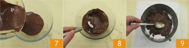 Despeje o chocolate com a manteiga sobre os biscoitos triturados 7 e misture 8 até obter uma mistura homogênea. Agora, pegue um anel de confeitaria de 20 cm, coloque-o em uma assadeira forrada com papel manteiga e posicione uma tira de acetato dentro. Despeje a mistura de biscoitos dentro e pressione delicadamente com as costas de uma colher 9.