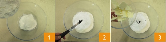 Para preparar a crostata de chocolate ruby comece pela Massa podre: em uma tigela coloque a farinha, o açúcar de confeiteiro 1, as sementes da fava de baunilha 2 e a manteiga fria em pedaços 3.