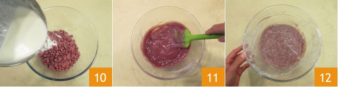 Assim que o creme de leite atingir o ponto de fervura, despeje sobre as pérolas de chocolate ruby 10. Mexa energicamente com uma espátula 11 emulsionando levemente, depois cubra com filme plástico e coloque na geladeira por pelo menos 2 horas 12.