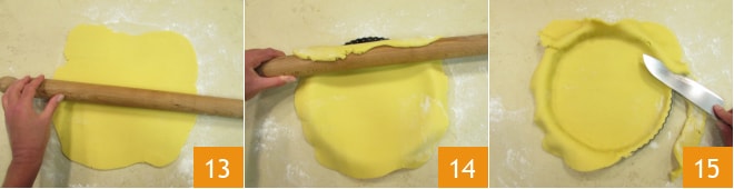 Enquanto isso, recupere a massa folhada, abra-a em uma superfície levemente enfarinhada até obter um círculo de aproximadamente 4 mm de espessura 13, envolva a massa em torno do rolo e desenrole em uma forma de 24 cm 14. Alise as bordas usando uma faca lisa 15.