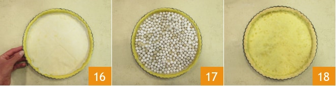 Coloque uma folha de papel manteiga no fundo da massa folhada 16 e utilize pesos de cerâmica para Como fazer a cocção às cegas 17: a crostata assa em forno estático, pré-aquecido em modo estático, a 180° por cerca de 20 minutos 18.