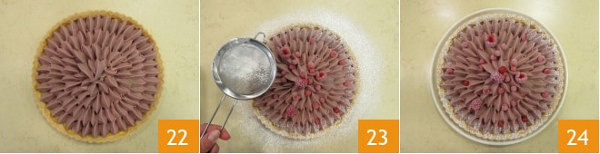 Complete a decoração com tufos de ganache para preencher também o centro 22 e finalize adicionando na superfície algumas frutinhas e uma pitada de açúcar de confeiteiro 23. Está pronta a sua crostata com chocolate ruby 24.
