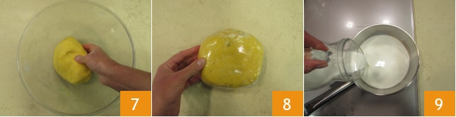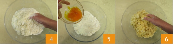 Trabalhe os ingredientes com a ponta dos dedos para obter uma mistura arenosa grosseira 4, adicione as gemas 5 e amasse novamente rapidamente 6.