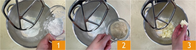 Para preparar a torta com creme de confeiteiro, chantilly e ameixas: na batedeira planetária, coloque os ingredientes secos 1 2, o sal e a manteiga fria em pedaços 3.