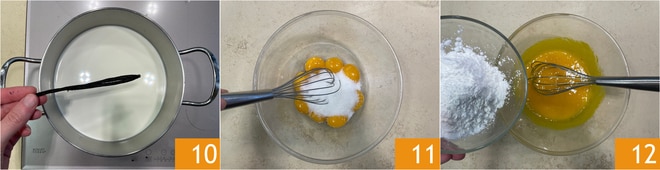 Para o creme de confeiteiro: em uma panela, aqueça até quase ferver o leite, o creme de leite e a fava de baunilha 10, enquanto isso em uma tigela misture as gemas e o açúcar com um batedor manual 11, depois adicione também o amido 12. Mexa novamente para obter uma mistura homogênea.