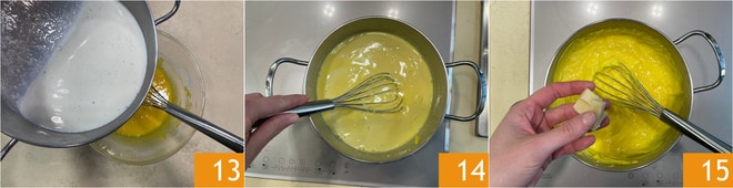 Despeje no composto de gemas, açúcar e amido o leite (após remover a fava de baunilha) 13, mexa, e coloque de volta no fogo 14, continuando a mexer até que o creme comece a ferver, neste ponto abaixe o fogo e acrescente o marzipã em cubos pequenos 15. Mexa para dissolver. Despeje o creme em um recipiente baixo e largo, cubra com filme plástico e coloque na geladeira até que esfrie. Uma vez pronto, transfira para um saco de confeitar sem bico.