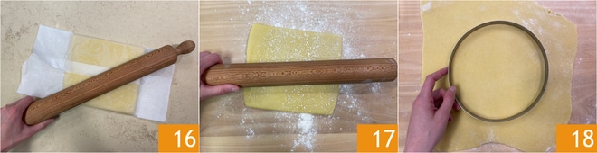 Retire o bloco de massa frola 16, estenda-a a uma espessura de 3-4 mm em uma superfície levemente enfarinhada 17. Corte a base com um anel de 22 cm 18.