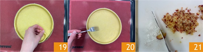 Coloque sobre uma assadeira, o papel manteiga ou um tapete slipat, posicione sobre o anel a base de massa frola 19. Em seguida, adicione também a borda de massa frola, feita de uma tira de massa com 2 cm de espessura e 66 cm de comprimento 20. Se você não conseguir mover a tira facilmente, pode fazer duas de 33 cm (ou até mais curtas) e uni-las diretamente na forma. Fure o fundo com um garfo, depois deixe esfriar na geladeira por 30 minutos, para que mantenha melhor a forma durante o cozimento. Asse a base em forno estático pré-aquecido a 175°C, por cerca de 25-30 minutos. Enquanto isso, corte as ameixas em fatias, retire algumas fatias para a decoração, as outras podem ser cortadas em cubos pequenos 21.