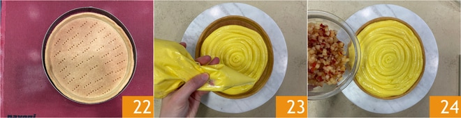 Uma vez que a base estiver pronta e fria 21, você pode rechear com o creme de confeiteiro, que também já está frio e colocado no saco de confeitar 23. Distribua também os cubos de ameixa 24.