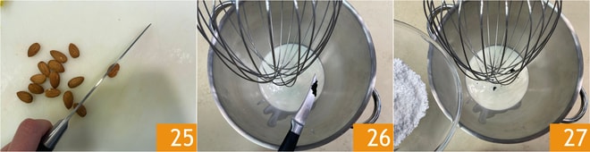 Corte as amêndoas em 4 partes no sentido do comprimento 25, depois prepare o chantilly batendo o creme de leite fresco com as sementes de meia fava de baunilha 26 e o açúcar de confeiteiro 27. Deve ficar semi batido.