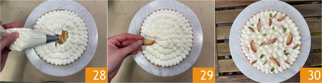 Despeje o creme em um saco de confeitar com bico liso de 10 mm e decore a torta, criando um padrão circular das bordas para o centro 28. Finalmente, decore com as fatias de ameixa 29, as amêndoas e algumas folhinhas de orégano fresco. Sua torta de creme de confeiteiro com amêndoas, chantilly e ameixas está pronta para ser servida 30!