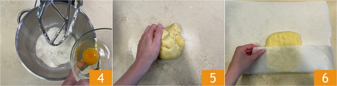 Bata com a pá até que a mistura fique parecida com areia, neste ponto acrescente o ovo 4 e bata devagar até que a massa fique lisa e homogênea. Retire da batedeira e trabalhe brevemente com as mãos 5 para dar uma forma quadrada, então coloque sobre papel manteiga o bloco de massa para embrulhá-lo 6.