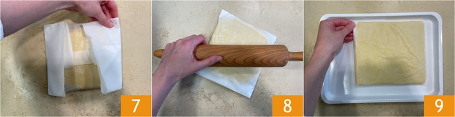 Feche bem 7 e com o rolo de massa achate-a mais 8, então coloque sobre uma bandeja 9 e deixe descansar na geladeira por pelo menos 30 minutos ou durante a preparação do creme de confeiteiro.