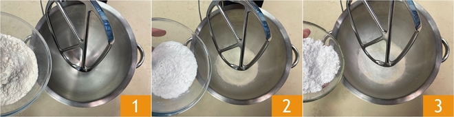 Para preparar a torta com ganache de chocolate branco e groselha, primeiro faça a massa. Na tigela de uma batedeira, coloque a farinha 1, o amido de milho 2 e o açúcar de confeiteiro 3.