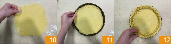 Deve-se abrir até ter uma espessura de 4-5 mm 10. Transfira para dentro de uma forma de torta de 24 cm 11, de preferência com fundo removível. Use a massa restante para criar as bordas. Deve-se esfarelar e colar em torno da forma, aderindo também à base 12.