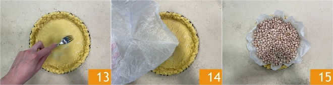 Fure com os dentes de um garfo 13 e coloque na geladeira por 30 minutos. Após o descanso, coloque um círculo de papel manteiga na base da massa 14. Adicione grãos de feijão seco ou as esferas apropriadas de cerâmica para cozimento às cegas 15, e asse em forno estático pré-aquecido a 175° por 30 minutos.