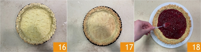 Passado esse tempo, retire os grãos e o papel manteiga sem se queimar 16 e leve novamente ao forno por mais 10 minutos. Depois, retire do forno 17 e deixe esfriar. Transfira a base da massa para um prato e espalhe a geléia de groselha dentro 18.