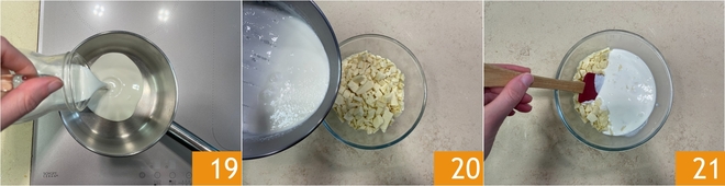 Agora prepare a ganache. Pique o chocolate branco e coloque em uma tigela. Em seguida, aqueça o creme de leite em uma panela e, assim que começar a ferver, despeje sobre o chocolate 20. Misture delicadamente com uma espátula 21 até que o chocolate esteja completamente derretido.