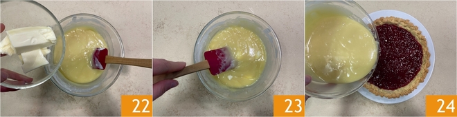 Adicione a manteiga macia em pedaços 22 e misture para emulsionar de forma homogênea 23. Despeje a ganache obtida dentro da torta 24.