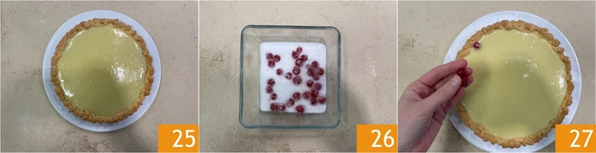 Neste ponto, coloque na geladeira por uma hora. A ganache ficará sólida 25. Passe as groselhas no açúcar 26 e use-as para decorar a torta 27.