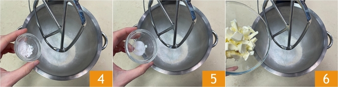 Adicione também o fermento em pó 4, uma pitada de sal 5 e a manteiga macia em cubos 6. Misture com a pá em velocidade moderada até obter uma mistura arenosa.