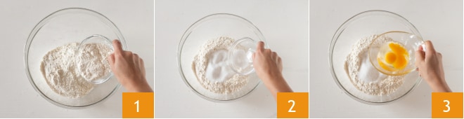 Para preparar a torta da vovó com pistache, primeiro faça a massa. Em uma tigela, coloque a farinha, o fermento 1 e o açúcar 2. Adicione também os ovos 3 e uma pitada de sal.
