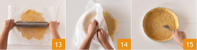 Quando o creme estiver bem frio, retire a massa da geladeira e divida-a ao meio. Abra cada uma das duas partes entre duas folhas de papel manteiga, usando um rolo de macarrão. Você deve obter uma espessura de cerca de meio cm 13. Nesse ponto, pegue uma forma de 26 cm de diâmetro, unte e enfarinhe. Com a ajuda do papel manteiga, transfira um dos discos de massa para dentro 14. Ajuste bem a massa nas bordas e remova o excesso usando uma faca. Então, fure a base com os dentes de um garfo 15.