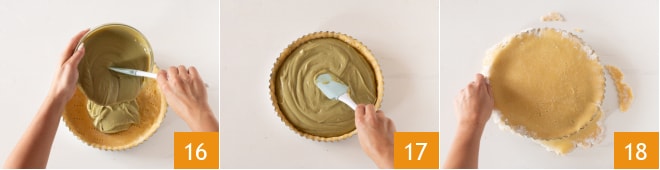 Coloque dentro o creme de confeiteiro com pistache 16, nivele bem com uma espátula 17 e feche com o outro disco, então sele as bordas pressionando levemente com os dedos 18. Assim, você também removerá o excesso de massa.